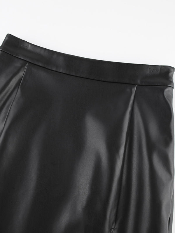 Women’s Solid Color Front Slit Faux Leather Midi Pencil Skirt
